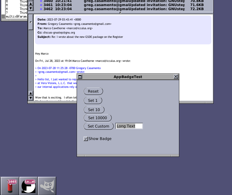 Later, proper badges support has been added in GNUstep, here the look with GNUMail and with a small test application, which is ported directly from Mac and compiled using xcode buildtool.